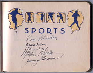 | Legend has it that Uncle Mart was accompanied on his trip to Florida by a brother of actor Robert Mitchum, who is purported to have been a croney of Martin's as well. The first signature on this page belongs to Ray Blades, who was the manager for the Cardinals in 1939 after a playing his whole career with them and finishing up with a .301 batting average. | |||||||||||||
